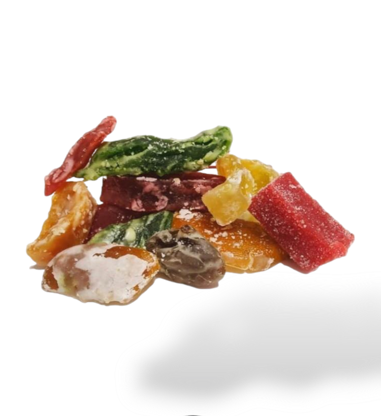 Imagen ilustrativa. Contiene higos glaseados, zapallo glaseado y cáscaras de limón glaseadas.