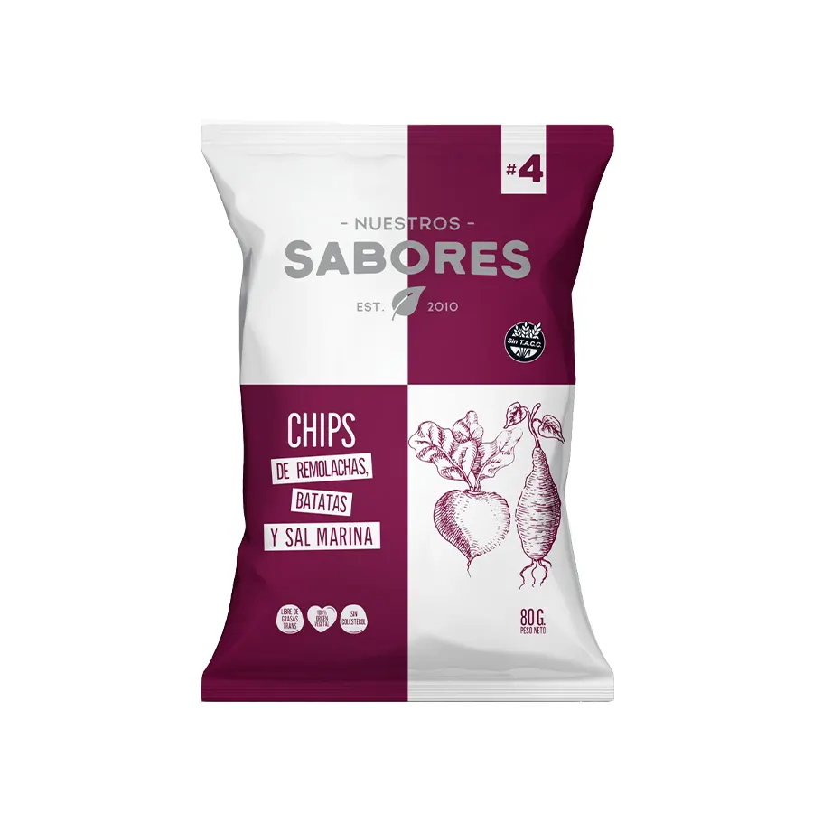 Mix de chips de batata y remolacha fritos 100% naturales, elaborados sin colorantes, conservantes ni saborizantes artificiales. Realzados con sal marina para un sabor auténtico y delicioso. Sin TACC.