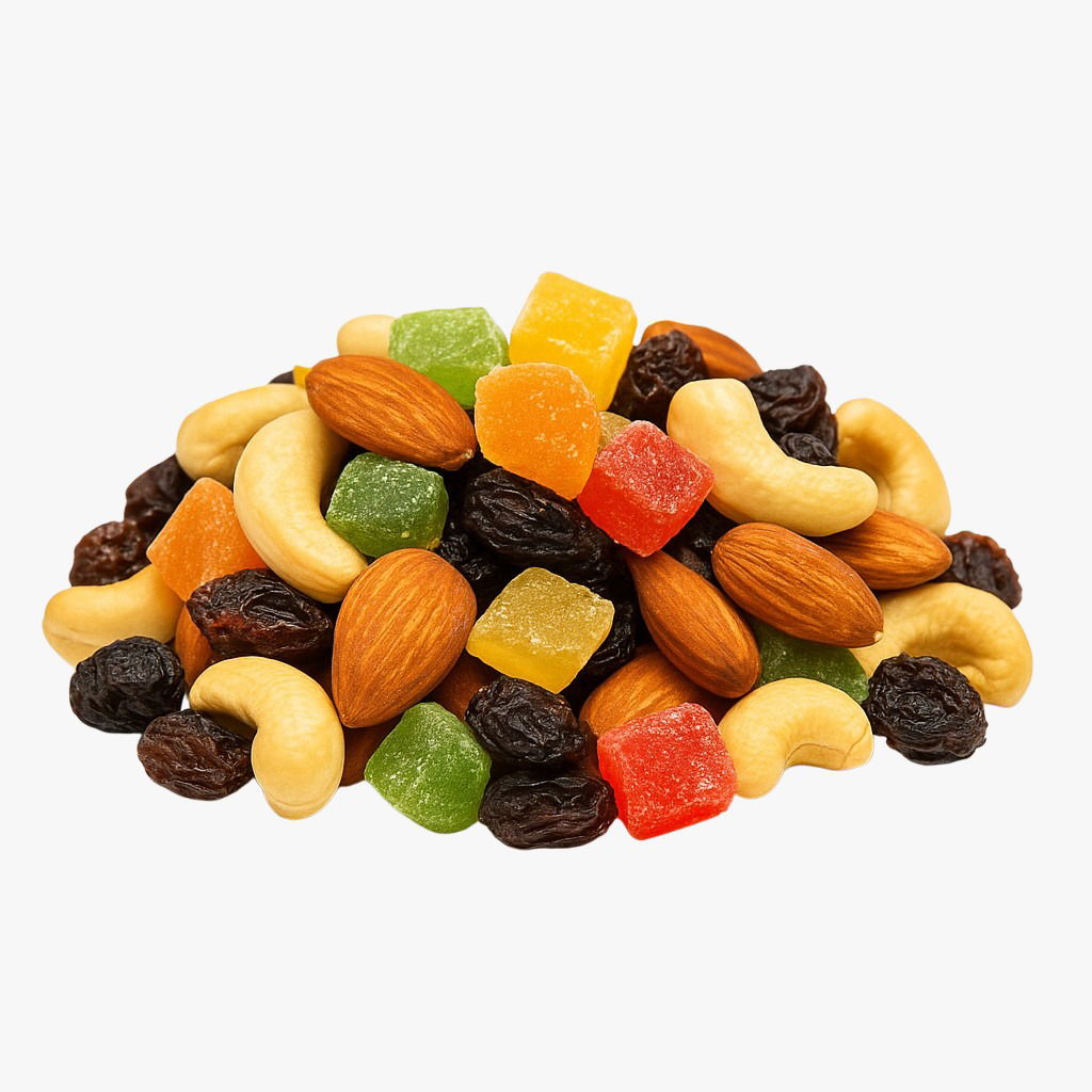 Contiene: Castañas de Caju, Almendras, Pasas de uva, frutas multicolor en cubos