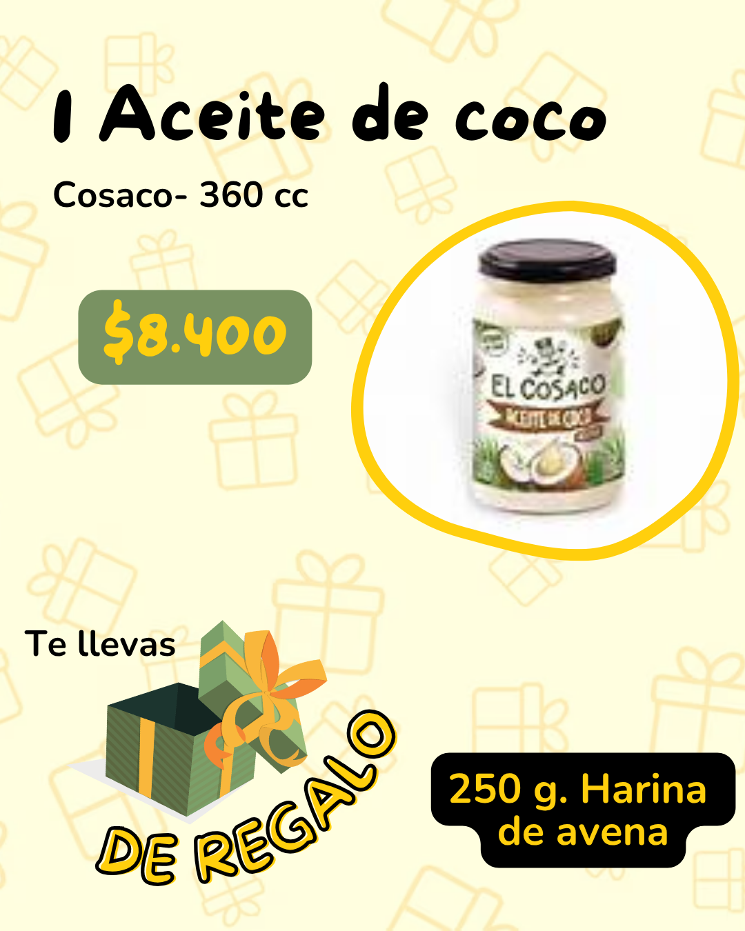 El precio publicado corresponde a 1 Aceite de coco neutro marca El cosaco de 360 cc + 250 g de Harina de avena que van DE REGALO!!!