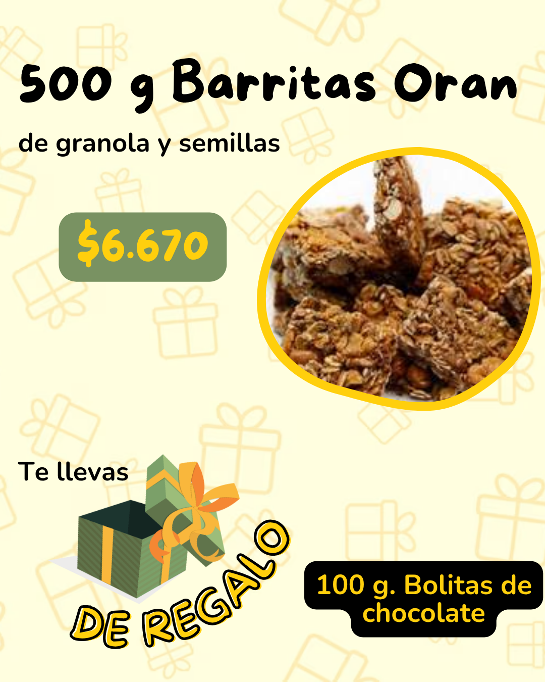 El precio publicado corresponde a 500 g Barritas Oran (de granola y semillas)+ 100 g. Bolitas de chocolate que van DE REGALO!!!