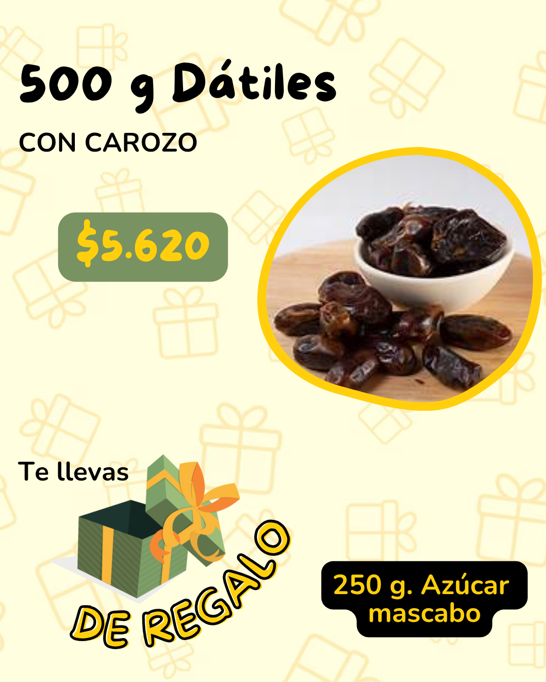 El precio publicado corresponde a 500 g. Dátiles con carozo + 250 g Azúcar mascabo que van DE REGALO!!!