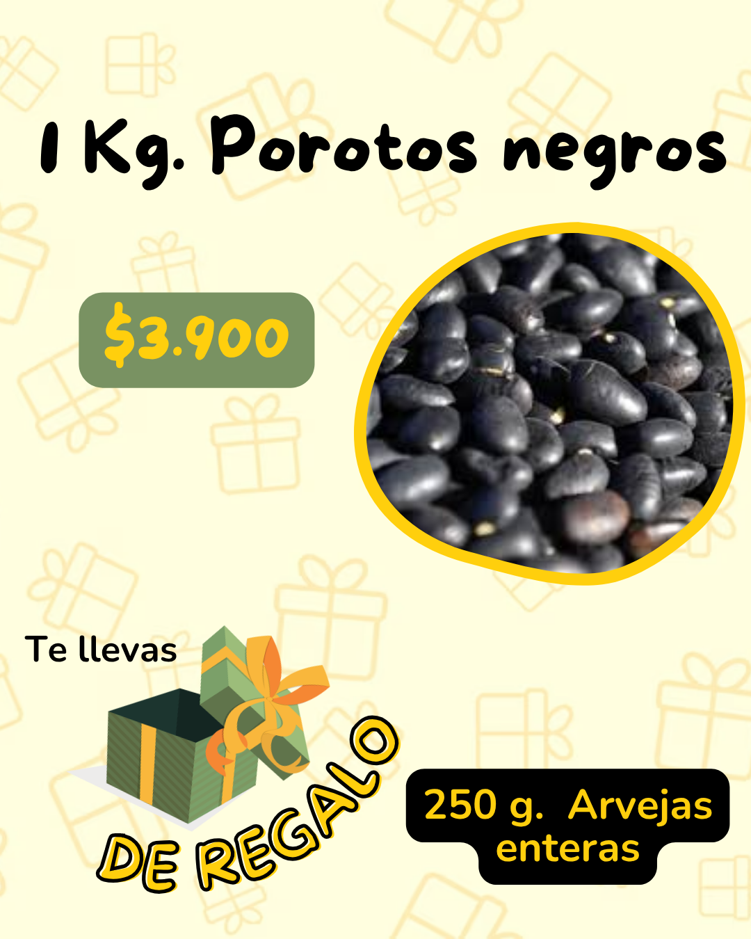 El precio publicado corresponde a 1 kg Porotos negros + 250 g. Arvejas enteras que van DE REGALO!!!