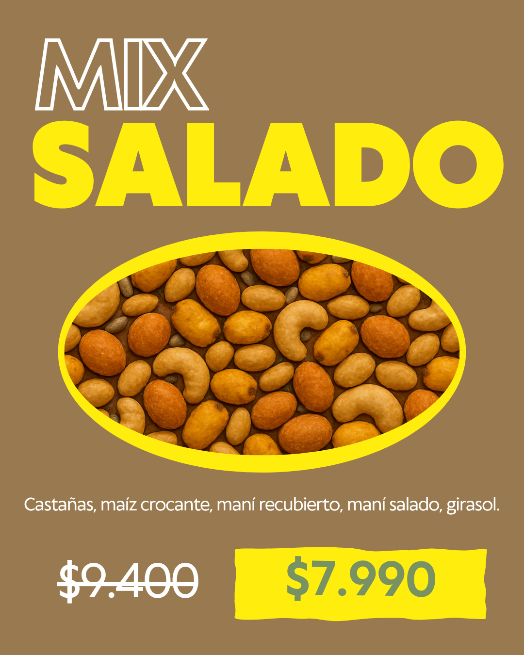 CONTIENE: maiz frito crocante, castañas, mani recubierto saborizado, mani salado, semillas de girasol pelado.